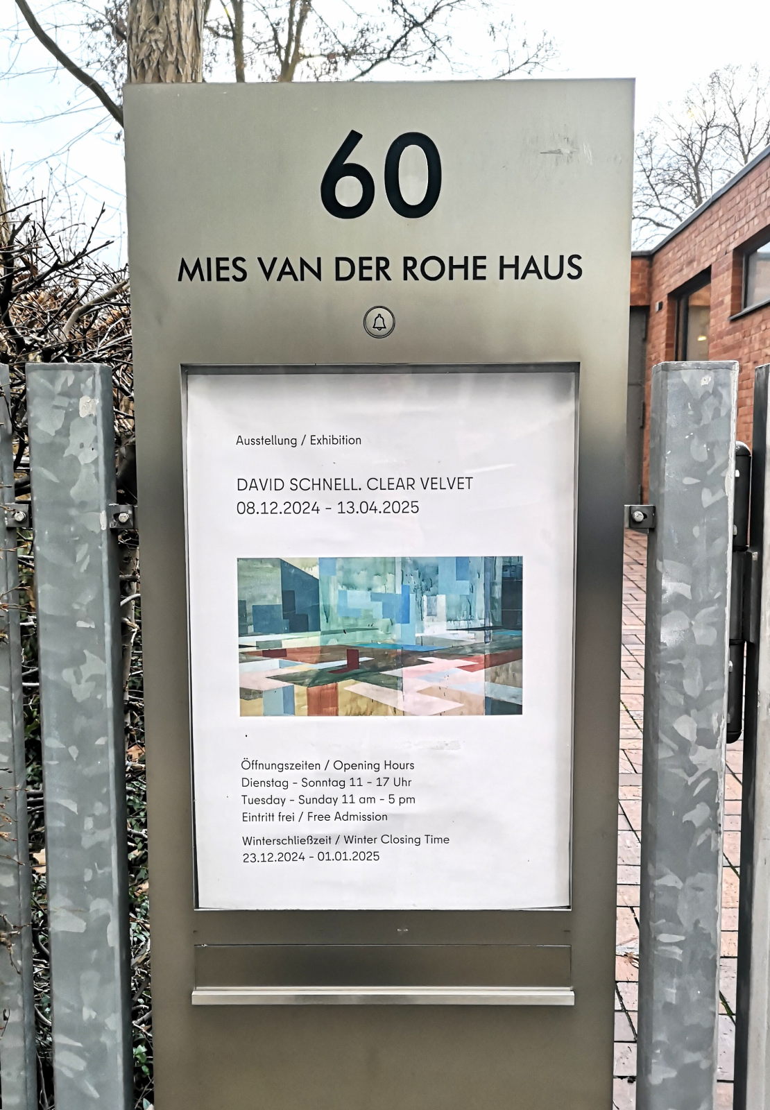 Berlin, Mies van der Rohe Haus Im Osten der Stadt, in Alt-Hohenschönhausen ist dieses Schmuckstück zu finden. Darin eine kleine sehenswerte Ausstellung von David Schnell „Clear Velvet“ vom 08.12.2024 – 13.04.2025. Eintritt kostenlos. [Zeige eine Slideshow]